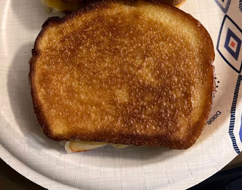 - Butter one side of each slice of bread and put buttered side down in the warm griddle.